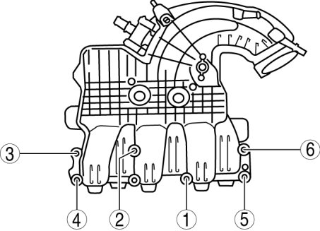 Tighten the intake manifold installation bolts in the order shown.Tightening torque 8.5-11.5 Nm {87-117 kgf-cm, 76-101 in-lbf}