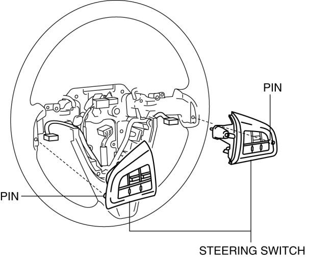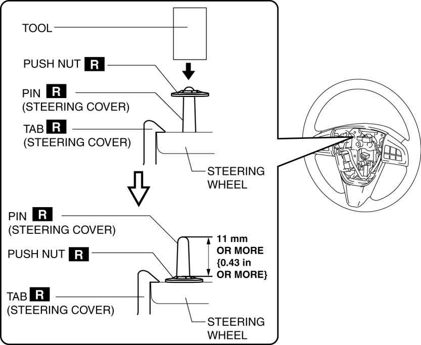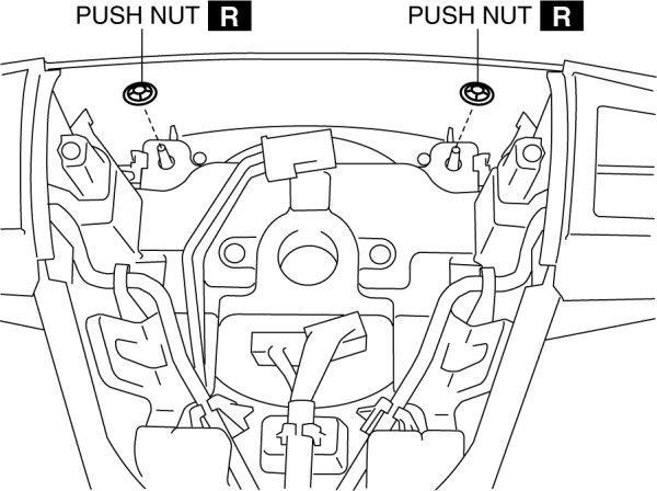 - A removed steering cover cannot be reused as it can no longer be secured after the push nuts are removed due to the possibility of the steering cover pins being damaged. Do not remove the push nuts except when replacing the steering switch and the steering wheel.