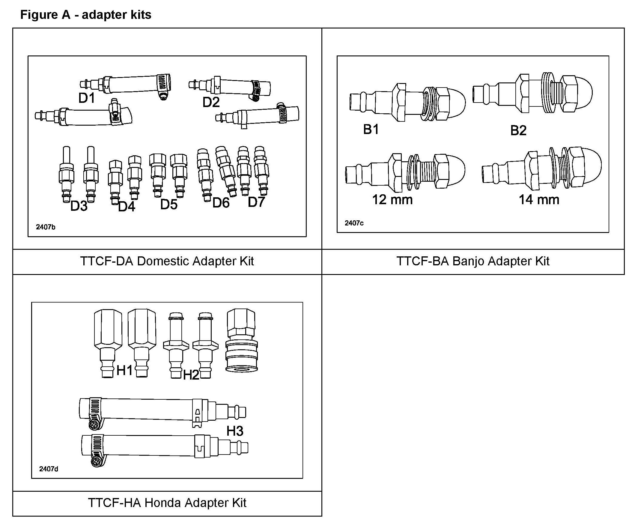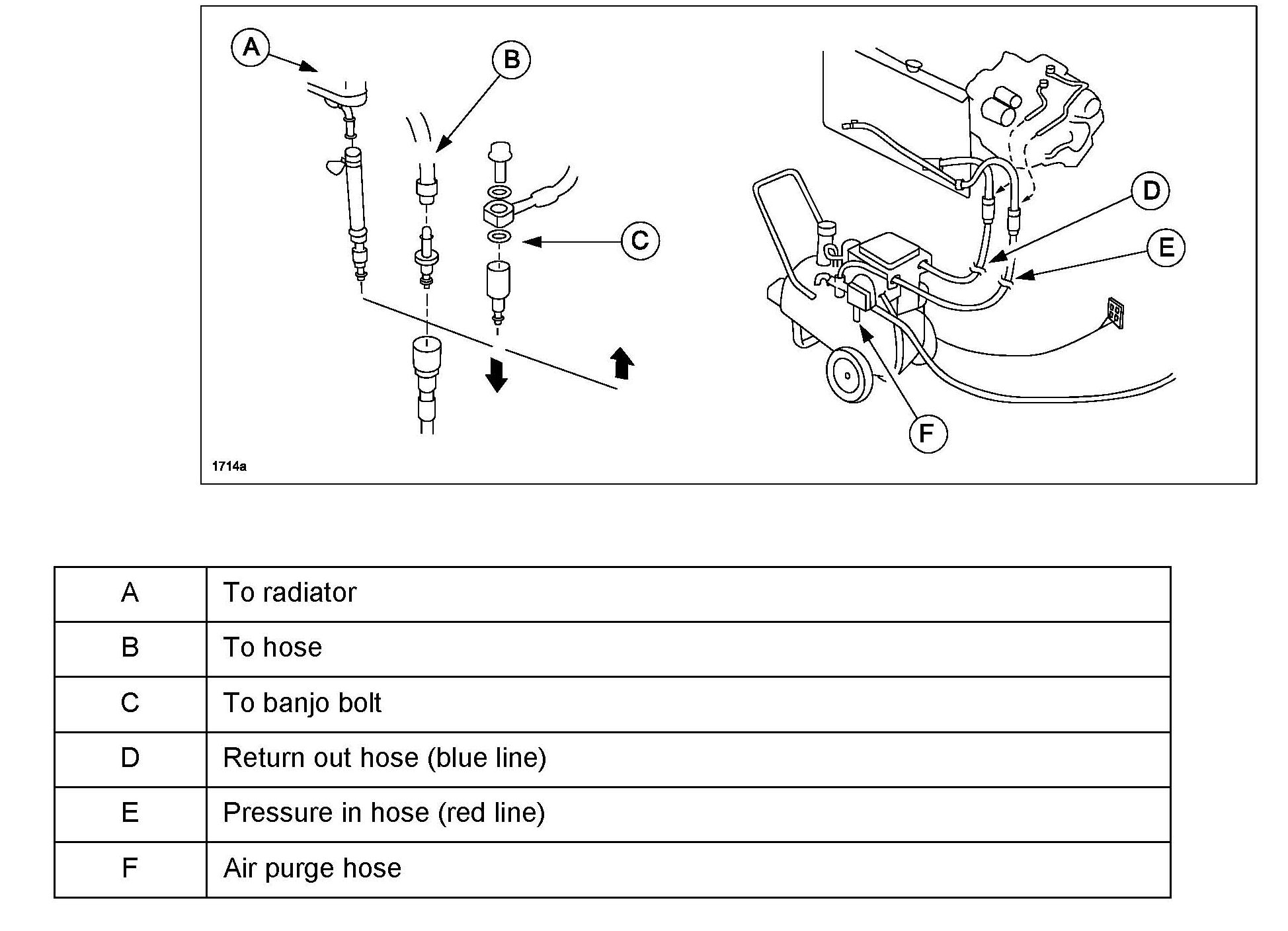 4. Install the appropriate quick disconnect line adaptors to the ATF cooler inlet and outlet lines using any of the three methods in Figure below (radiator (A), hose (B), or banjo bolt (C)). Connect the red pressure hose to the cooler inlet line (E). Connect the blue return hose to the cooler outlet line (D) (the line coming from the vehicle's cooler tank going to the transmission).