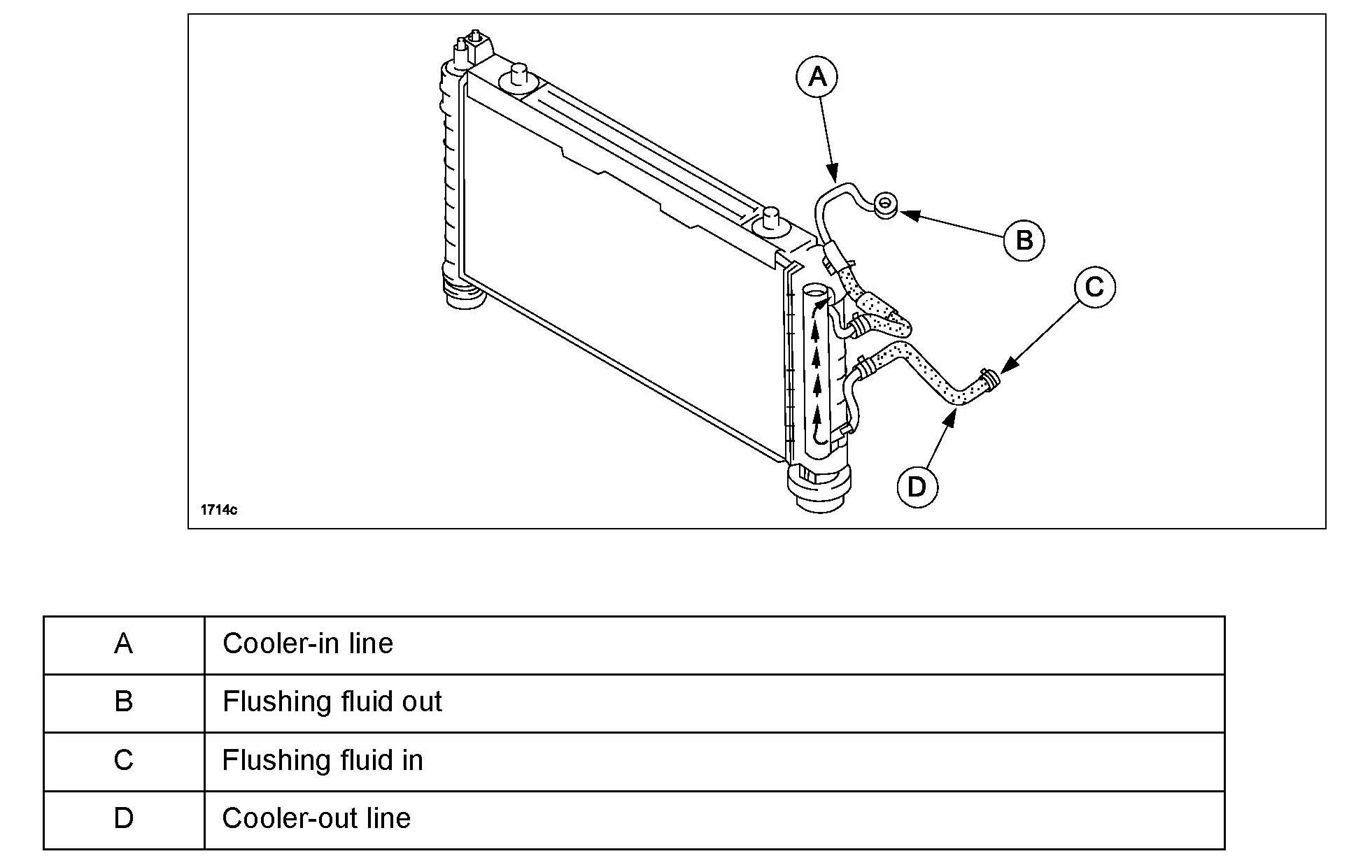 Before power flushing, inspect the hoses/lines and clamps on the vehicle. Repair or replace as necessary. Power flushing must begin with back flushing, followed by forward flushing to dislodge a restriction, then back flushing again. If back flushing is not performed before forward flushing, the restriction could further reduce the automatic transmission fluid (ATF) flow through the internal mesh type baffle (C) of the cooler and flushing will not be effective or possible.