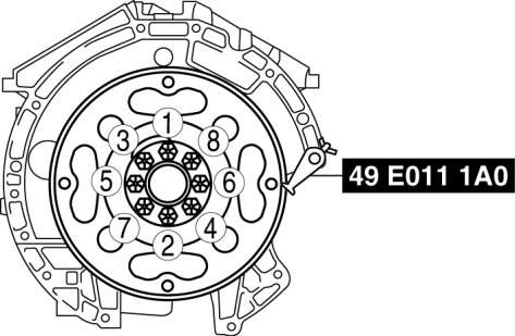 2. Loosen the drive plate installation bolts uniformly in two or three steps in the order shown in the figure, then remove the bolts and the drive plate.