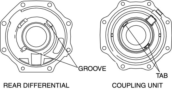 2. Install the coupling unit to the rear differential so that the two tabs on the coupling unit engage the rear differential grooves (two locations).