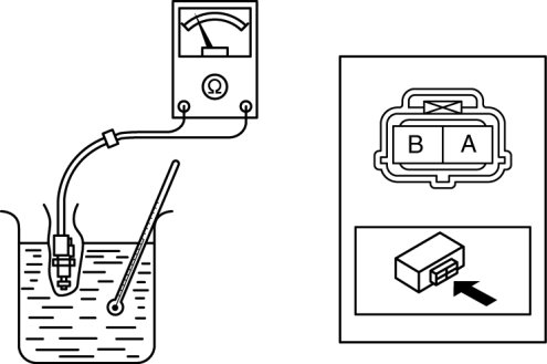 3. Wrap the differential oil temperature sensor with plastic wrap and immerse it into a beaker filled with water. Gradually raise the water temperature, and measure resistance between differential oil temperature sensor terminals A and B.