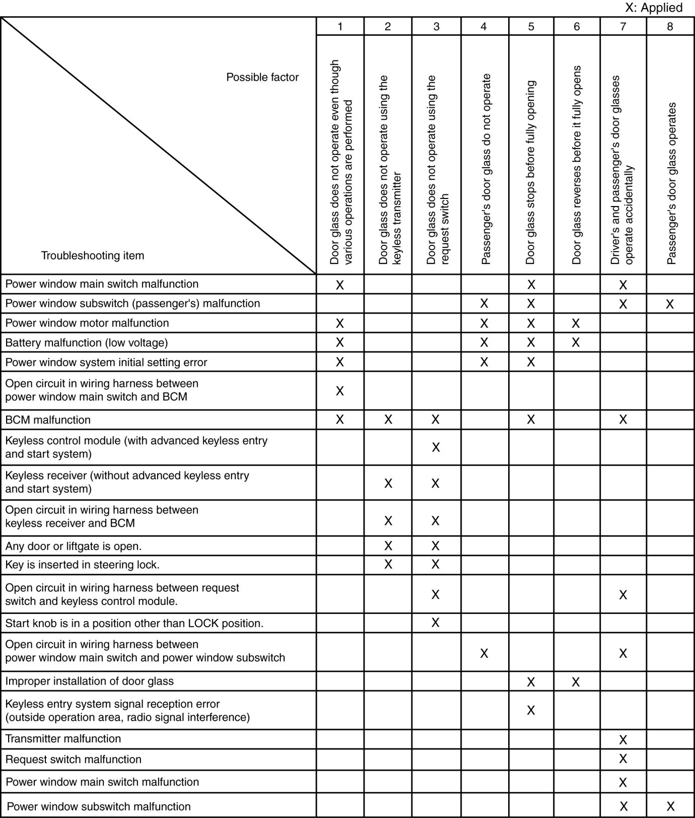 QUICK DIAGNOSTIC CHART [POWER WINDOW SYSTEM (EXTERIOR OPEN FUNCTION)]