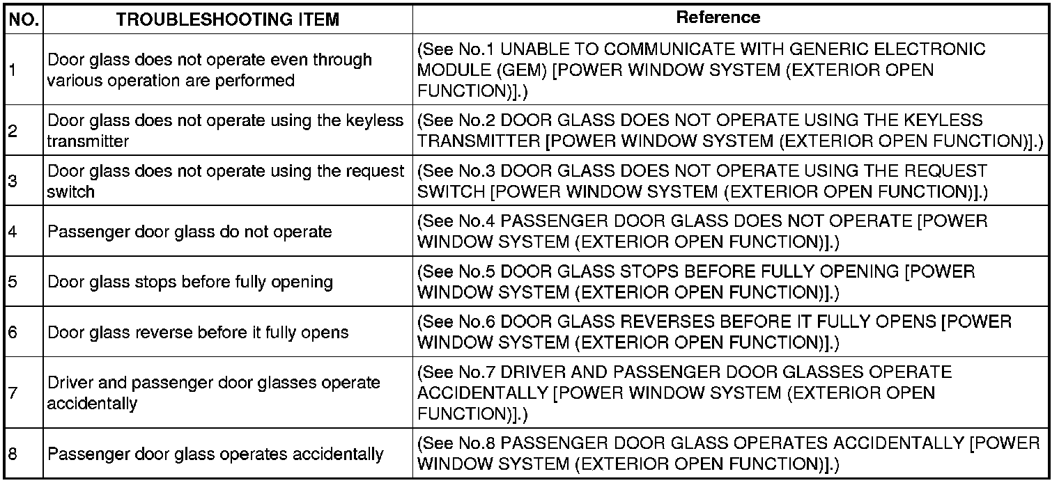 SYMPTOM TROUBLESHOOTING CHART [POWER WINDOW SYSTEM (EXTERIOR OPEN FUNCTION)]