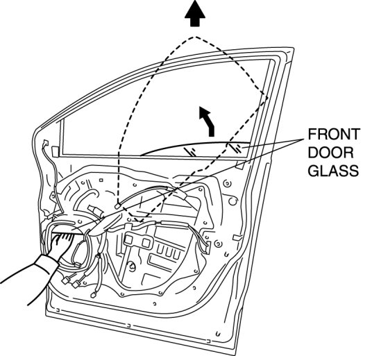 8. Lift the front door glass up and remove it in the direction of the arrow.