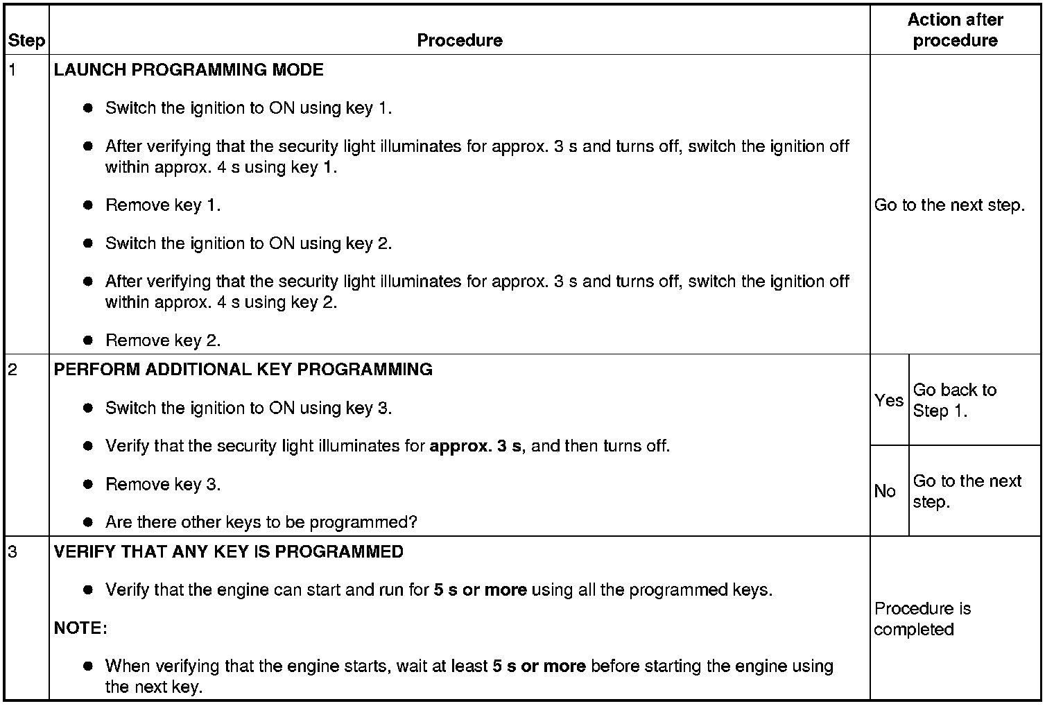 - If the engine is started during immobilizer system-related parts programming, the programming mode cancels. Therefore, do not start the engine unless indicated in the procedure. Repeat the procedure from the beginning if the engine is started during the immobilizer system-related parts programming.