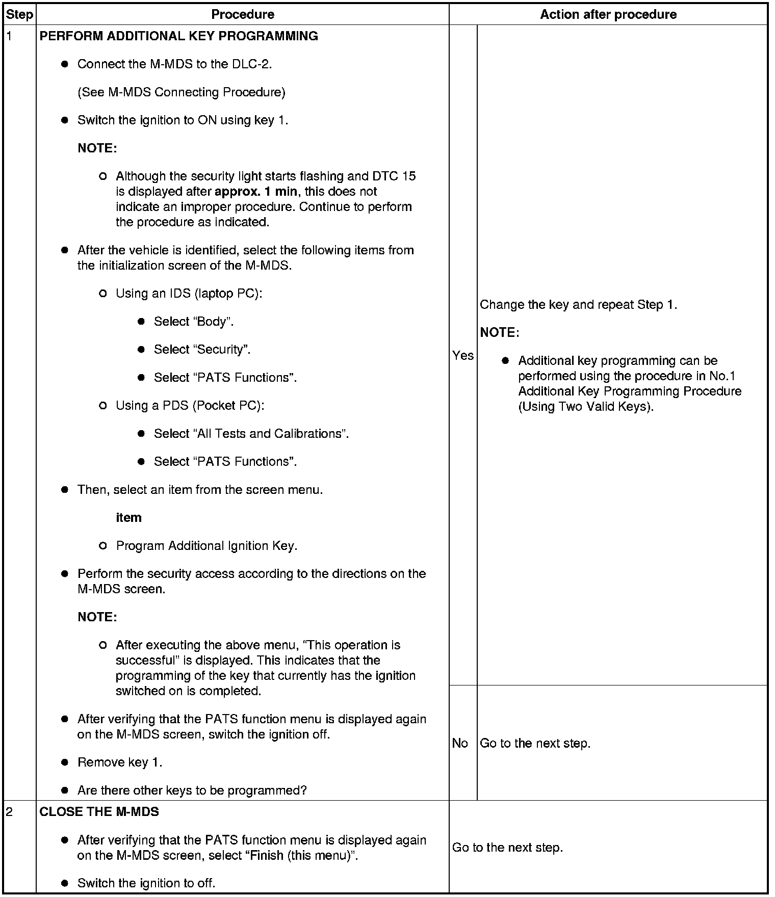 - If a key ID number cannot be programmed and DTC 15 is displayed, the maximum number of programmed keys may have been reached. Verify the number of programmed keys using the M-MDS.