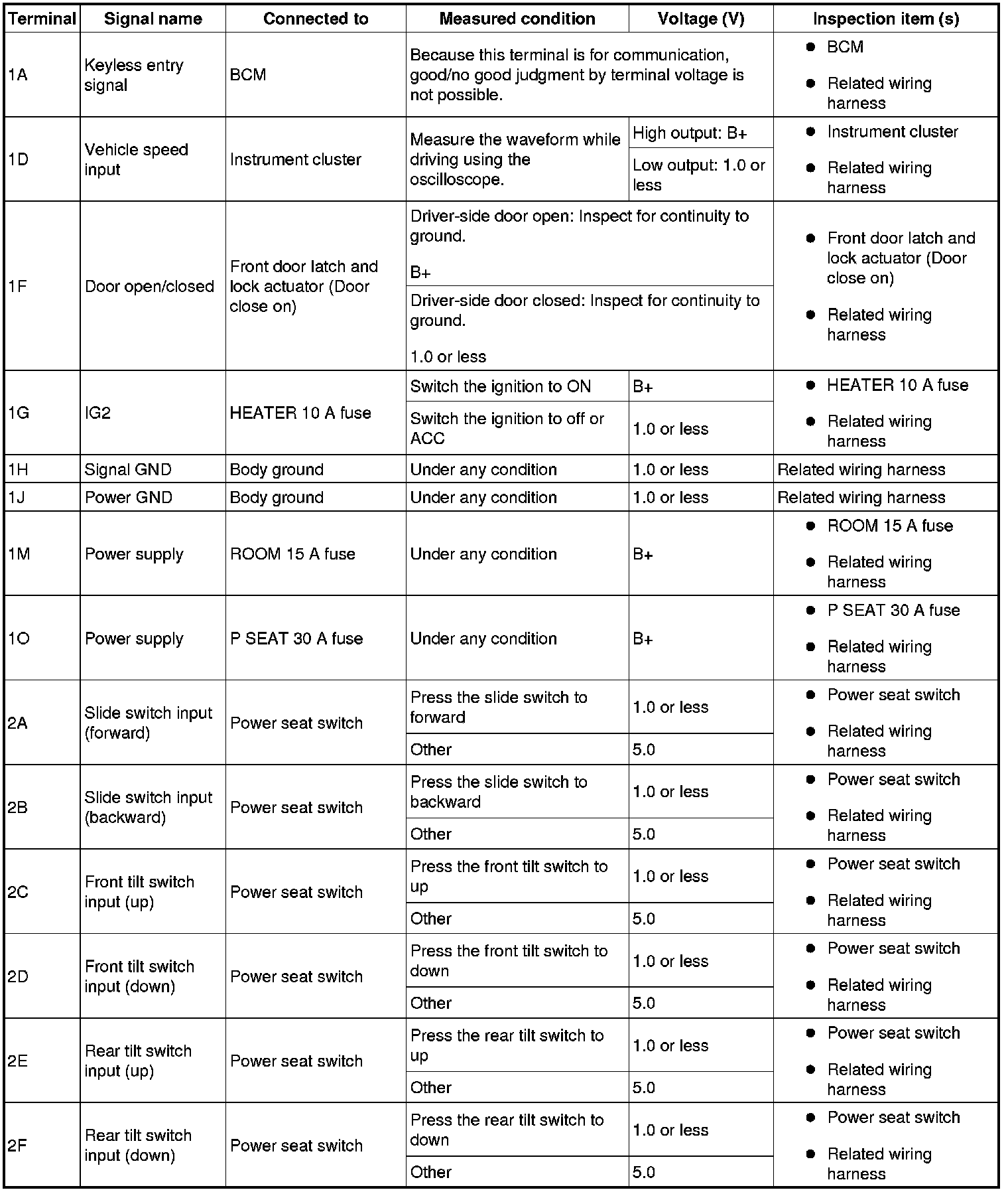 2. If the system does not work properly even though the inspection items or related wiring harnesses do not have any malfunction, replace the power seat control module.