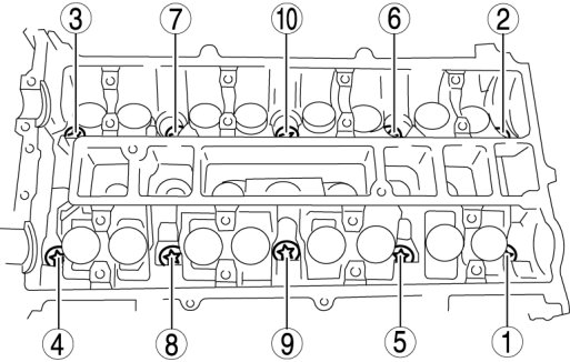 1. Loosen the cylinder head bolts in 2-3 steps in the order shown in the figure.