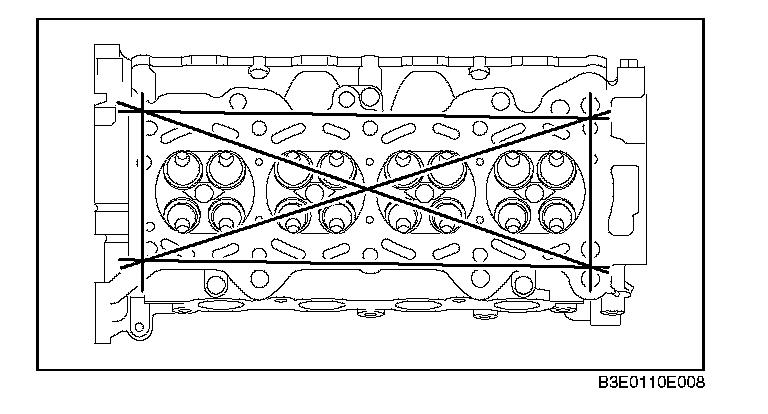 2. Measure the combustion chamber side of the cylinder head for distortion in six directions as shown in the figure using a straight edge and feeler gauge.
