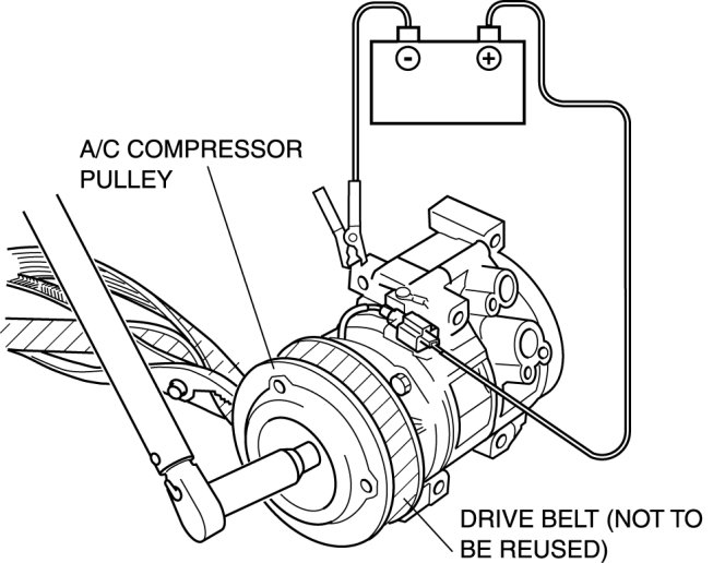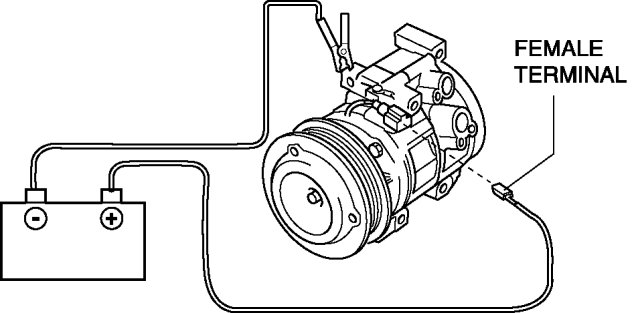 a. Apply battery positive voltage to the magnetic clutch terminal and connect the A/C compressor body to the ground.