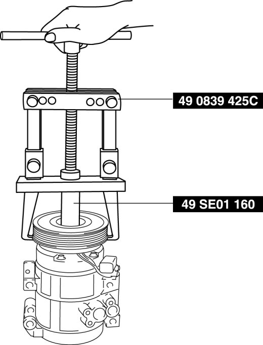 1. Remove the A/C compressor pulley using the SSTs (49 0839 425C, 49 SE01 160).