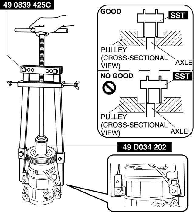 - If the SST is not properly positioned when the A/C compressor pulley is press-fit, the A/C compressor axle will interfere with the SST, possibly damaging component parts. Verify the SST and axle are properly positioned and perform the procedure very carefully.