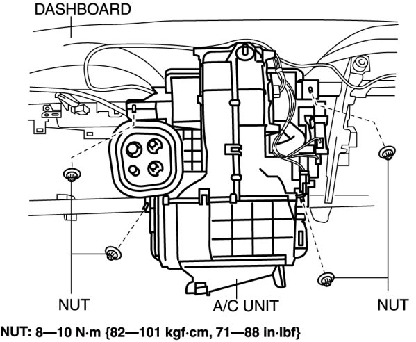 19. Remove the nuts for installing the A/C unit to the dashboard.