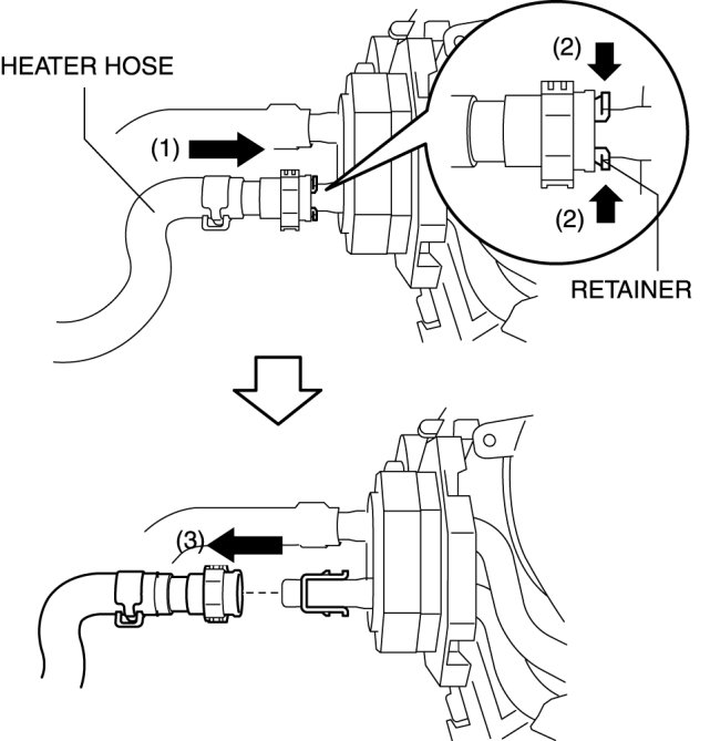 1. While pressing the heater hose into the A/C unit side (1), pinch the quick connector retainer (2), then disconnect the heater hose from the A/C unit (3).