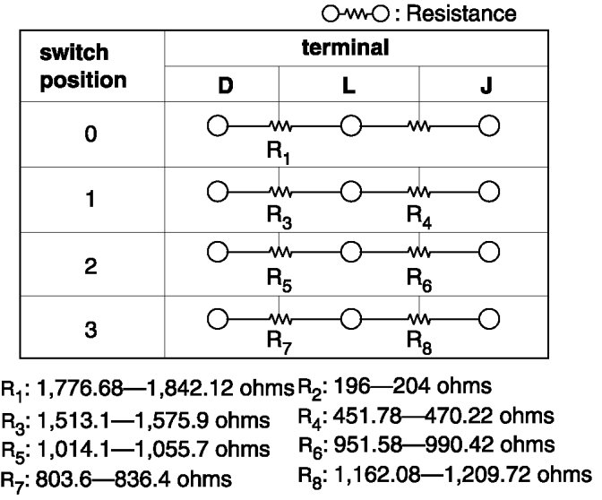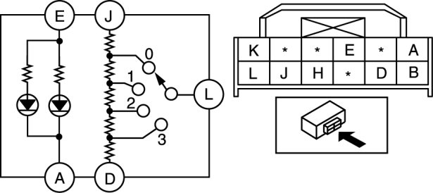 3. Verify that the resistance and continuity between the headlight leveling switch terminals is as indicated in the table using a tester.
