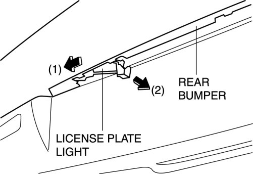 4. Pull the rear bumper in the direction of the arrow (1) in the figure, and pull out the license plate lights in the direction of the arrow (2).