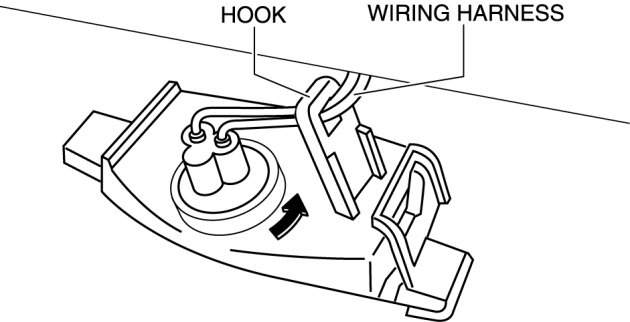 5. Pull out the wiring harness in the direction of the arrow and set it aside from the hook.