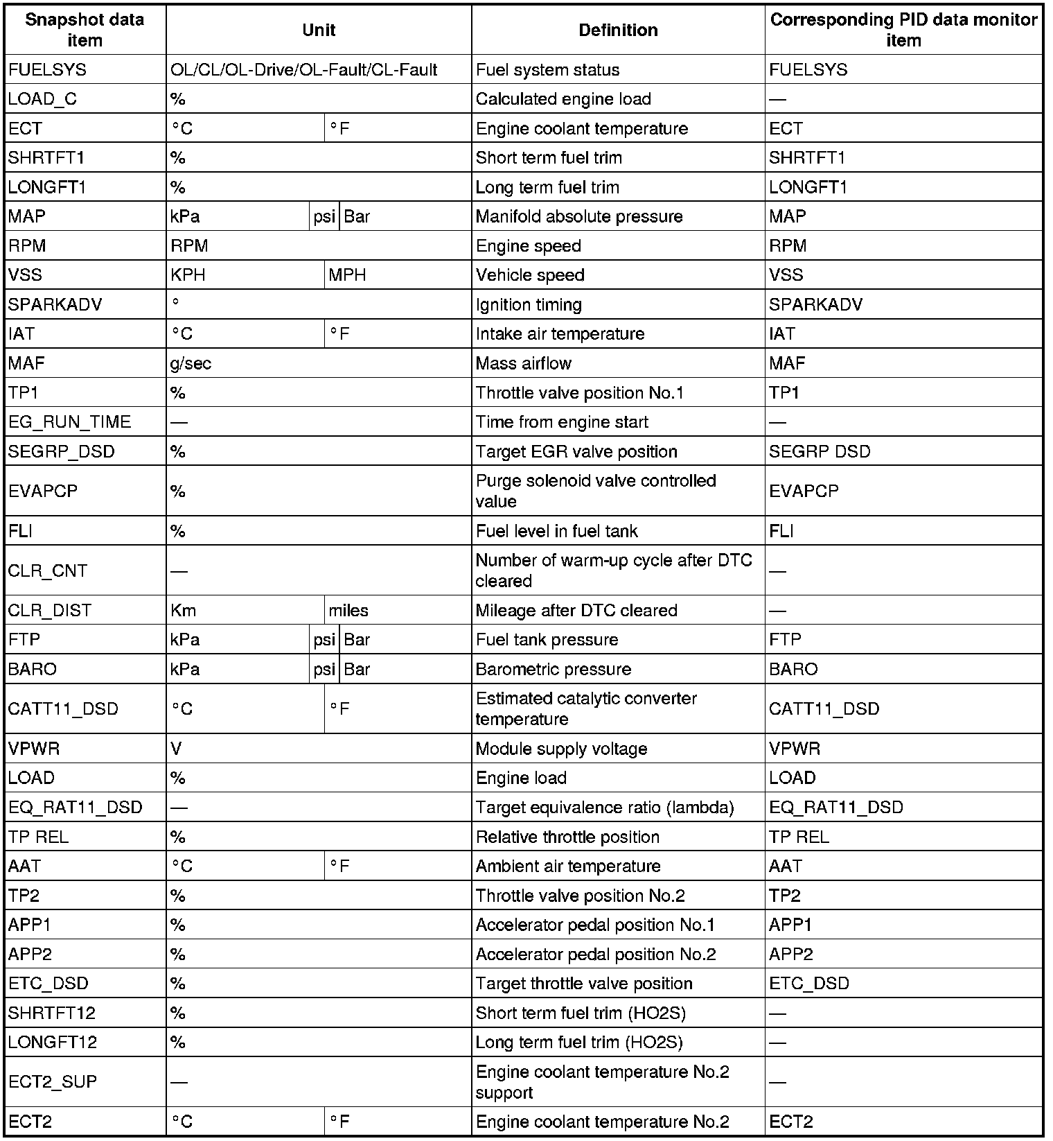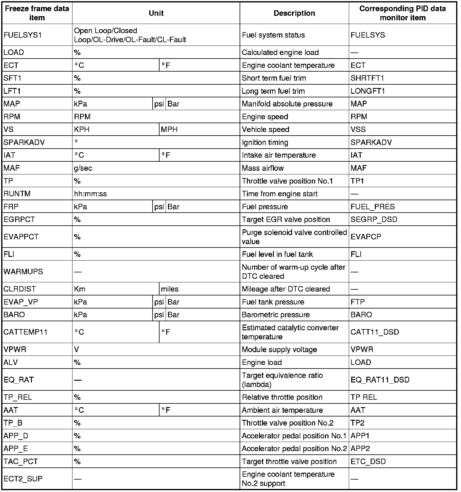 - For the freeze frame data, if there are several malfunctions in the engine control system, the data for the malfunction which occurred initially is stored. Thereafter, if a misfire or fuel injection control malfunction occurs, data from the misfire or fuel injection control malfunction is written over the initially stored data. However, if the initially stored freeze frame data is a misfire or fuel injection control malfunction, it is not overwritten.