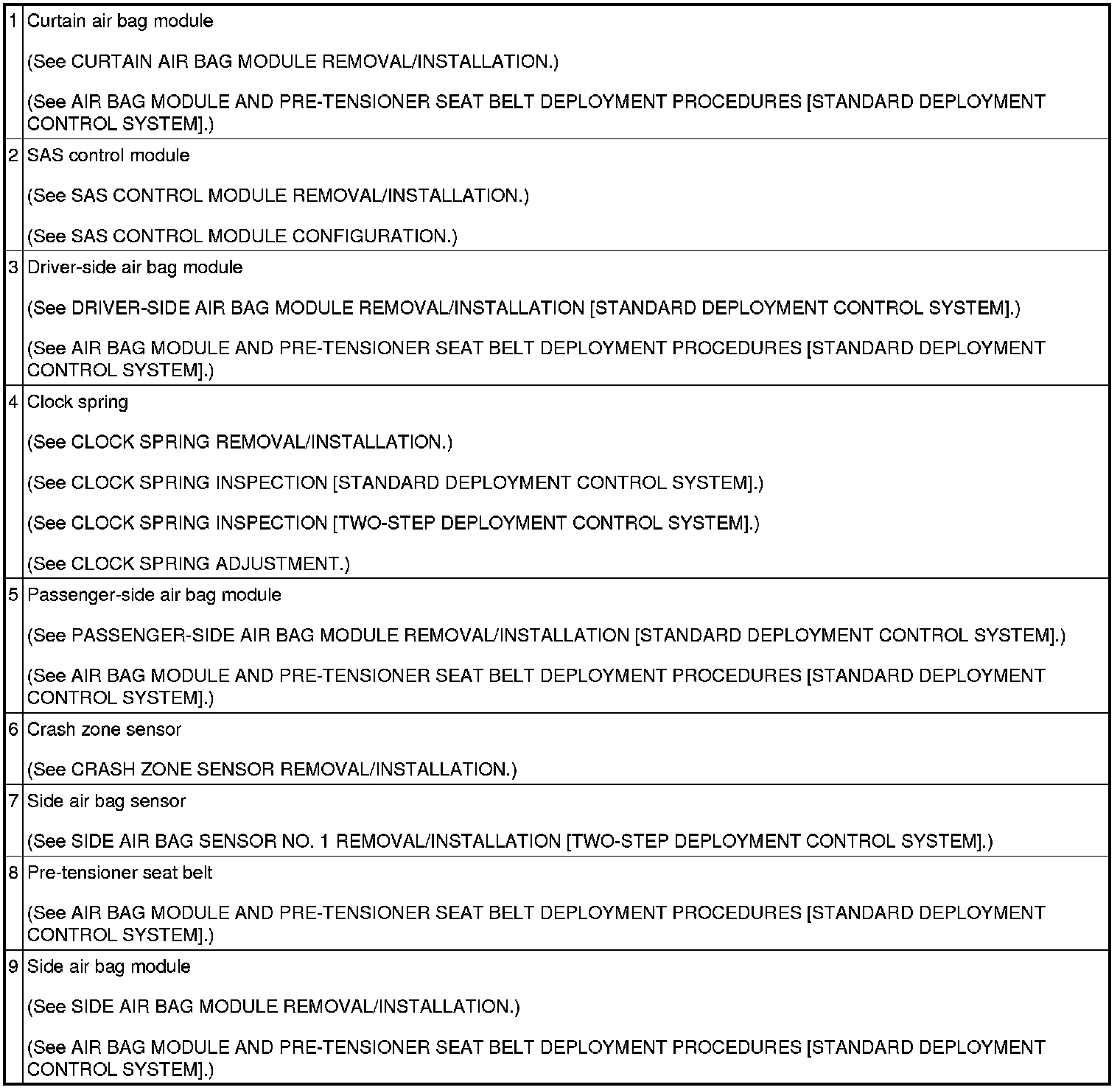 AIR BAG SYSTEM LOCATION INDEX [STANDARD DEPLOYMENT CONTROL SYSTEM]