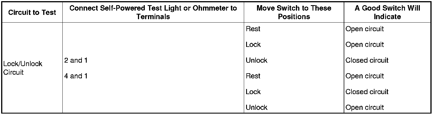2. Inspect for continuity between the door lock control switch terminals using a self-powered test light or an ohmmeter.