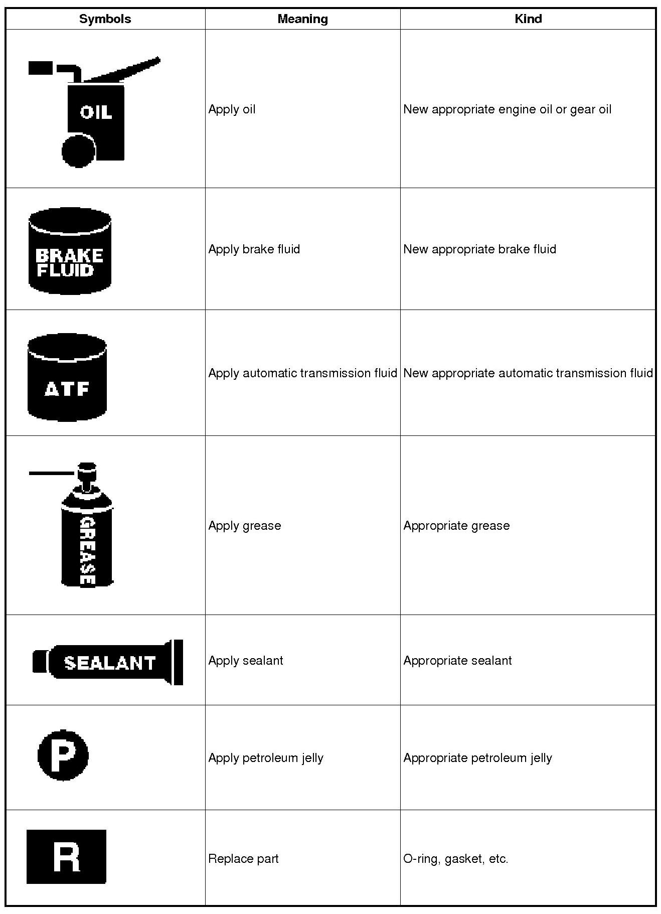 There are 8 symbols indicating oil, grease, fluids, sealant and special service tool (SST) use. These symbols show application points or use of these materials during service.