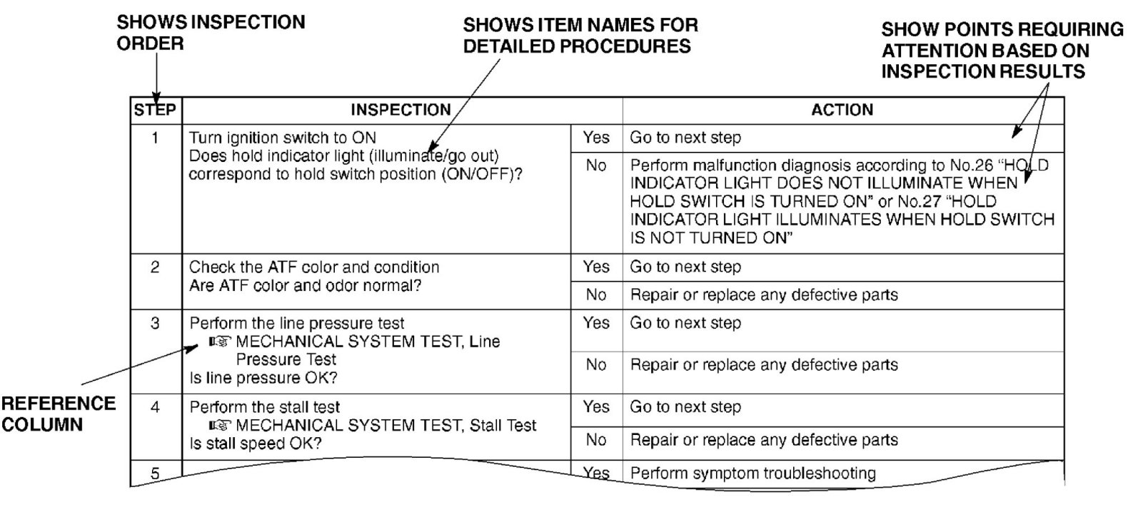 - Although inspections and adjustments are performed according to the reference column procedures, if the cause of the malfunction is discovered during basic inspection, continue the procedures as indicated in the remarks column.