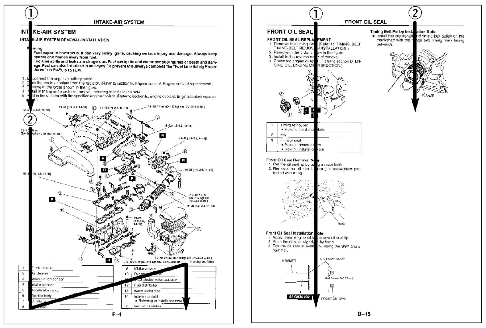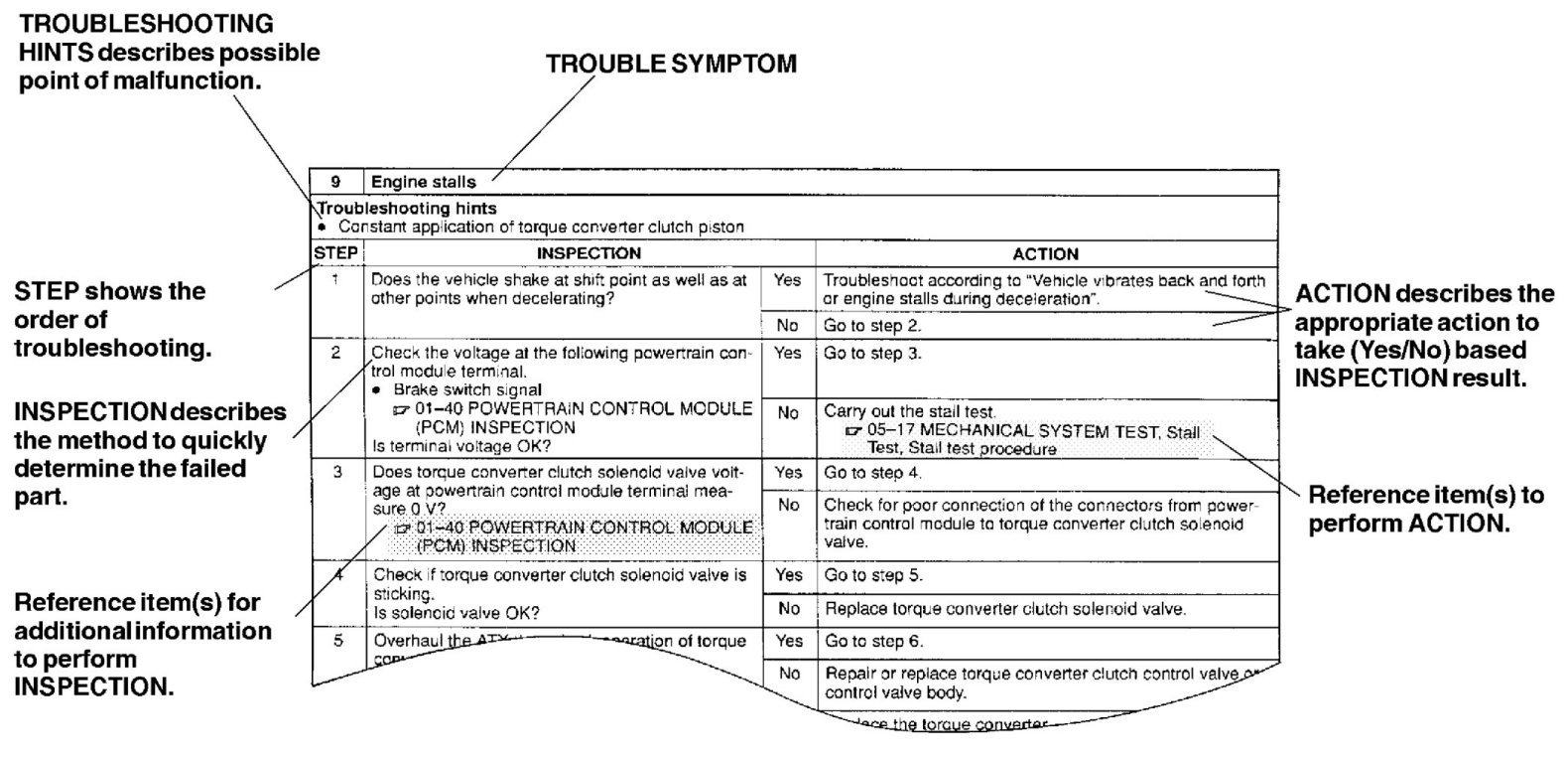 - Symptom troubleshooting shows diagnostic procedures, inspection methods, and proper action to take for each trouble symptom.