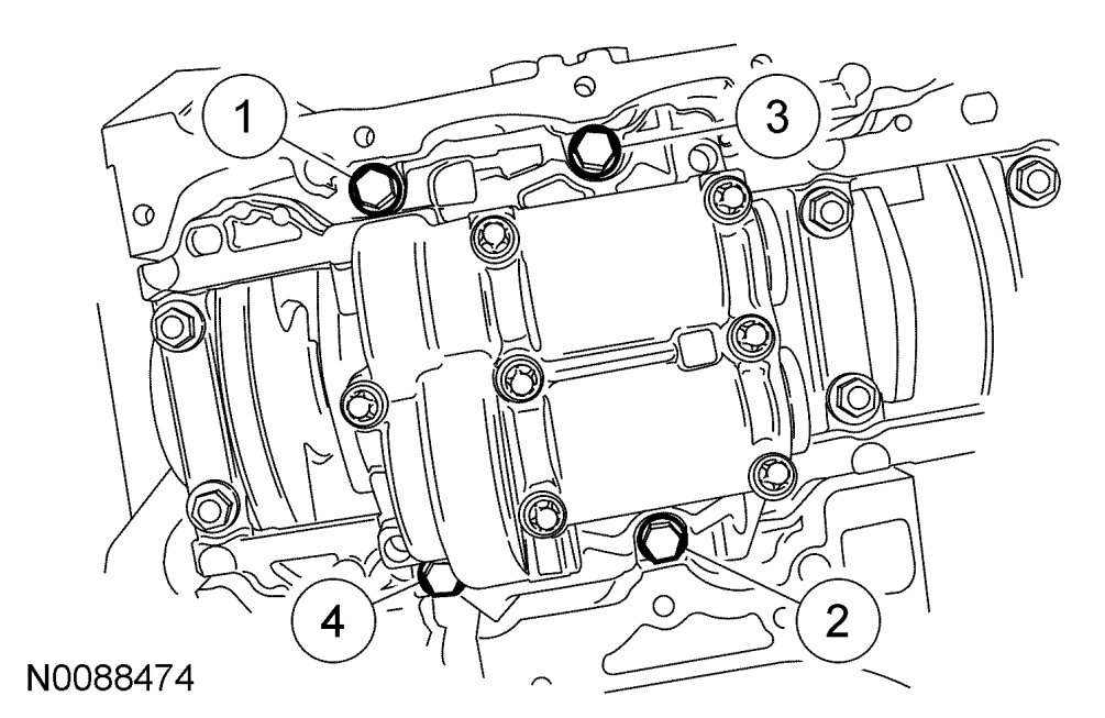 NOTE:Lubricate the main bearing beam bolts threads and under the bolt heads with clean engine oil.