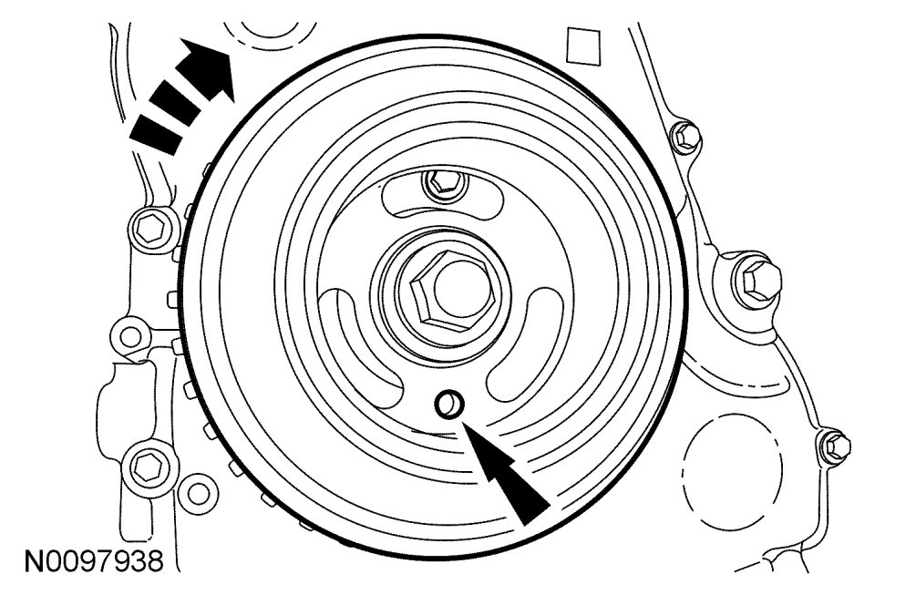 NOTE:The Crankshaft TDC Timing Peg will contact the crankshaft and prevent it from turning past TDC. However, the crankshaft can still be rotated in the counterclockwise direction. The crankshaft must remain at the TDC position during the crankshaft pulley removal and installation.