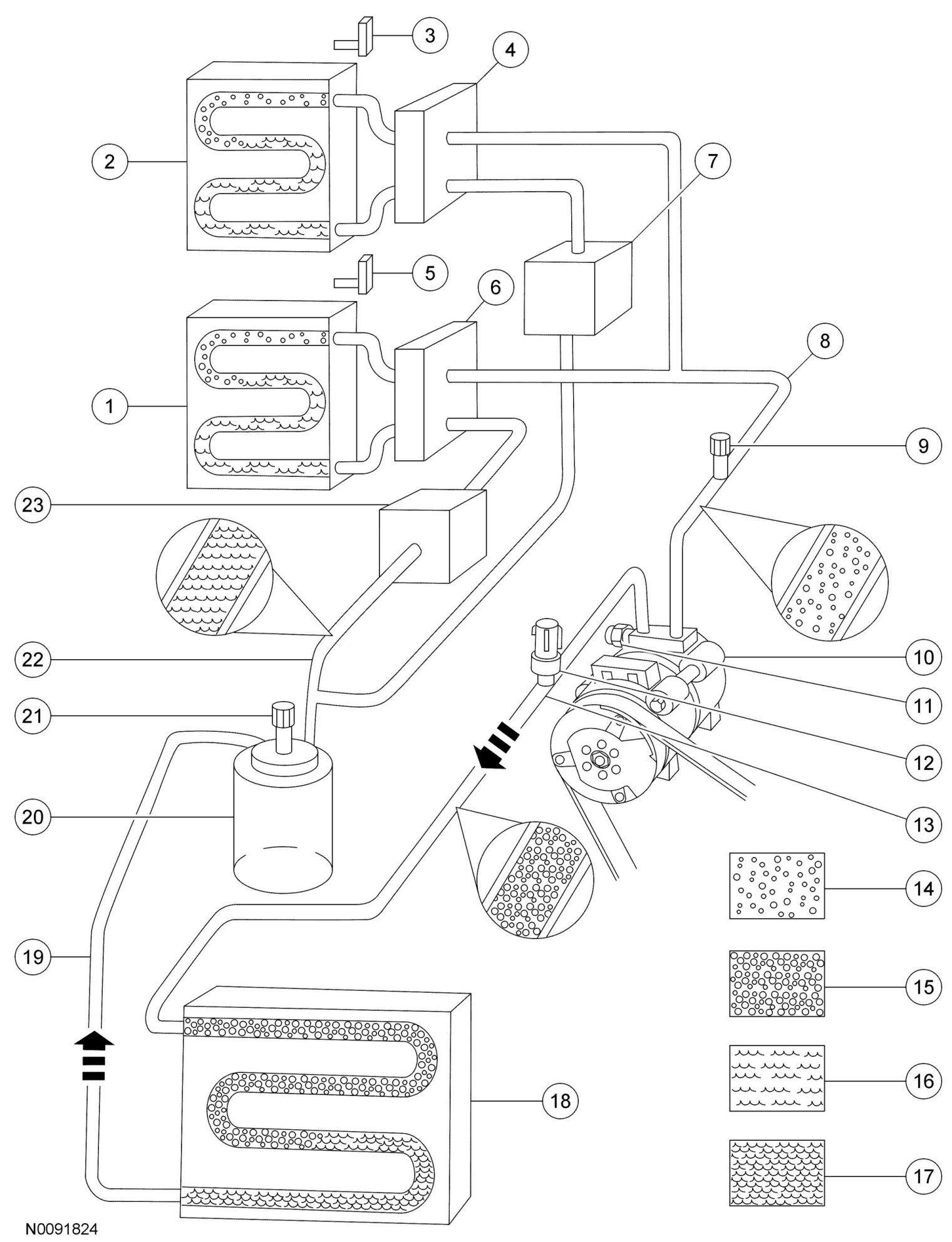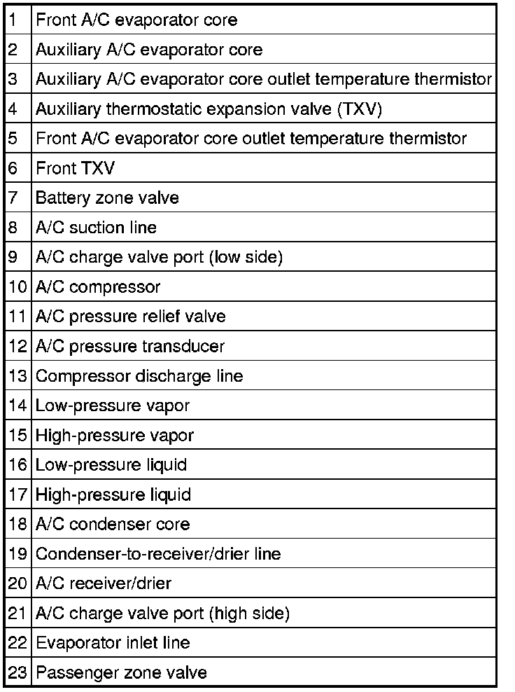 During stabilized conditions (air conditioning system shutdown), the refrigerant pressures are equal throughout the system. When the A/C compressor is in operation, it increases pressure on the refrigerant vapor, raising its temperature. The high-pressure and high-temperature vapor is then released into the top of the A/C condenser core.The A/C condenser, being close to ambient temperature, causes the refrigerant vapor to condense into a liquid when heat is removed from the refrigerant by ambient air passing over the fins and tubing. The now liquid refrigerant, still at high pressure, exits from the bottom of the A/C condenser and enters the inlet side of the A/C receiver/drier. The receiver/drier is designed to remove moisture from the refrigerant.The outlet of the receiver/drier is connected to the thermostatic expansion valve (TXV). The TXV provides the orifice, which is the restriction in the refrigerant system, and separates the high- and low-pressure sides of the A/C system. As the liquid refrigerant passes across this restriction, its pressure and boiling point are reduced.The liquid refrigerant is now at its lowest pressure and temperature. As it passes through the A/C evaporator, it absorbs heat from the airflow passing over the plate/fin sections of the A/C evaporator. This addition of heat causes the refrigerant to boil (convert to gas). The now cooler air can no longer support the same humidity level of the warmer air. This excess moisture condenses on the exterior of the evaporator coils and fins and drains outside the vehicle.