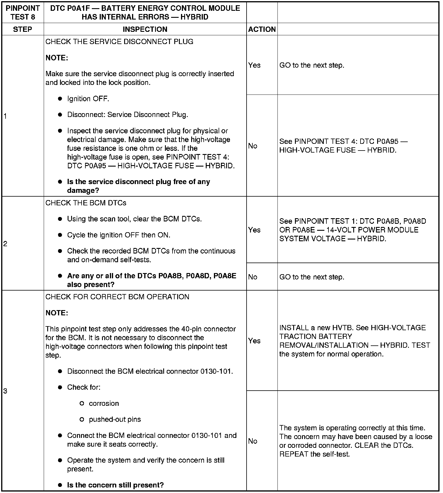 PINPOINT TEST 8: DTC P0A1F - BATTERY ENERGY CONTROL MODULE HAS INTERNAL ERRORS - HYBRID