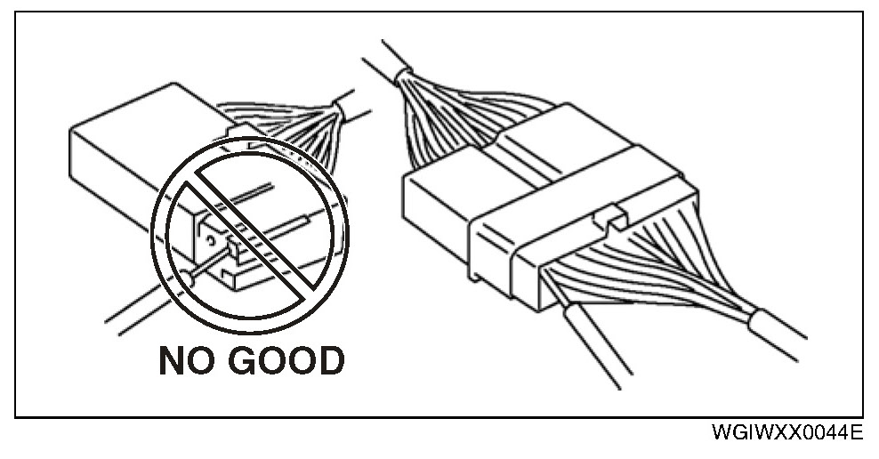 - When a tester is used to inspect for continuity or measuring voltage, insert the tester probe from the wiring harness side.