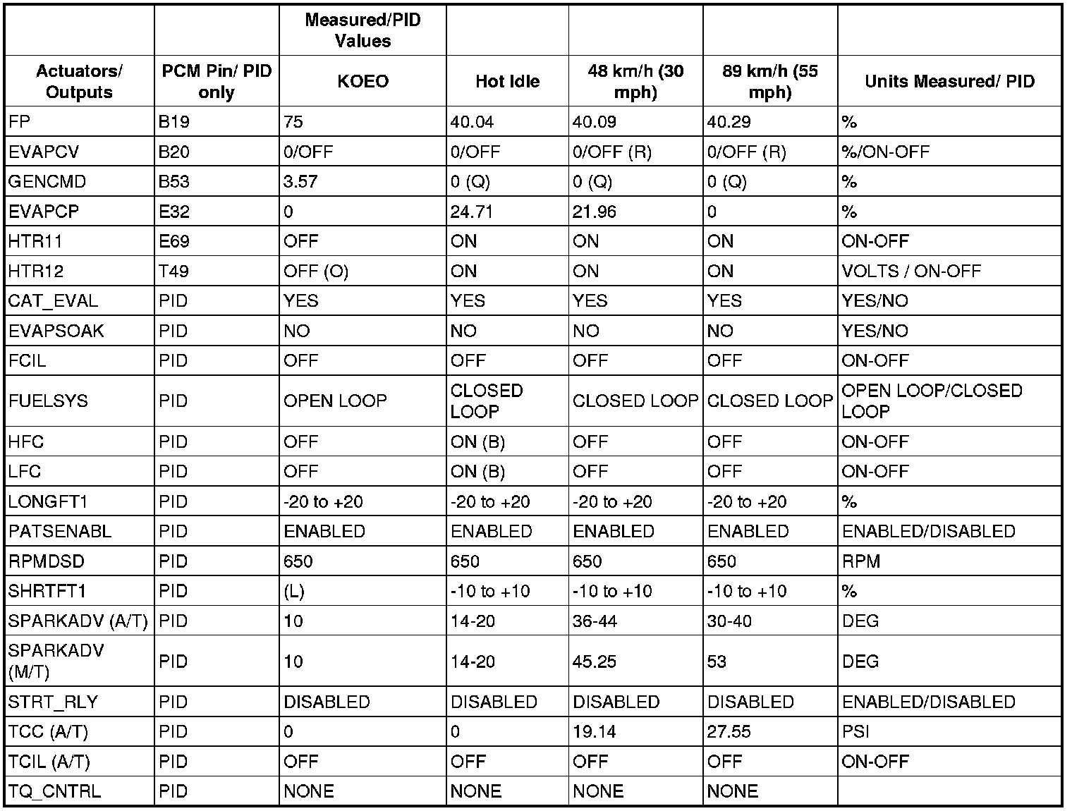 Values are taken at an altitude of approximately 189 meters (620 ft) above sea level with the engine at normal operating temperature and accessories off.See the Introduction Section, Acronyms and Definitions for technical terms applicable to Mazda Motor Company products.See Engine Control (EC) System for PID descriptions.For detailed transmission diagnostics, see Diagnostics. Transmission signals may be referred to in either alpha or numeric form. For example, 1=A, 2=B, 3=C.