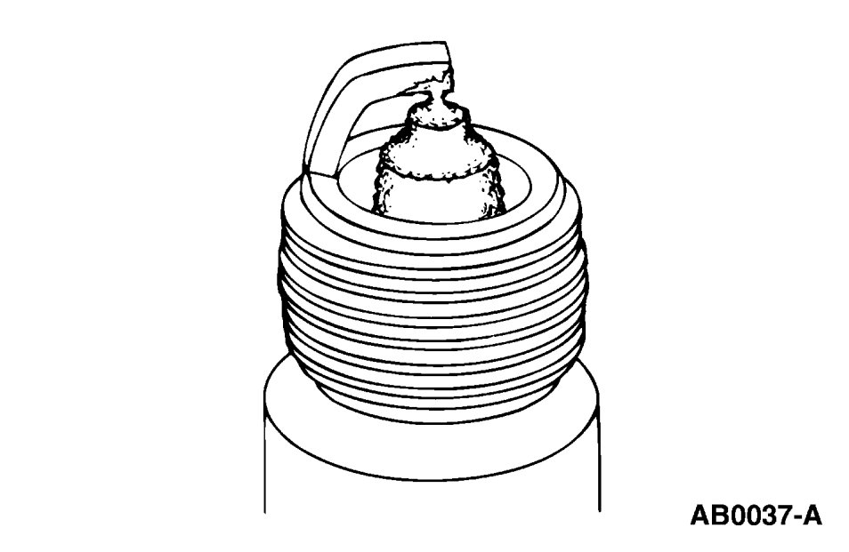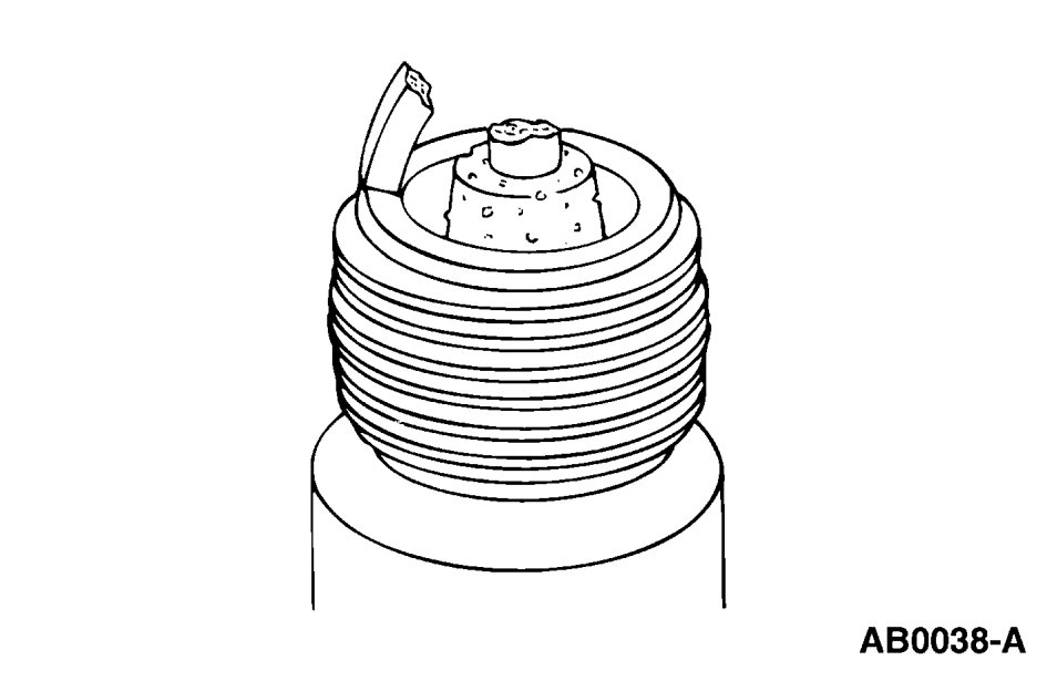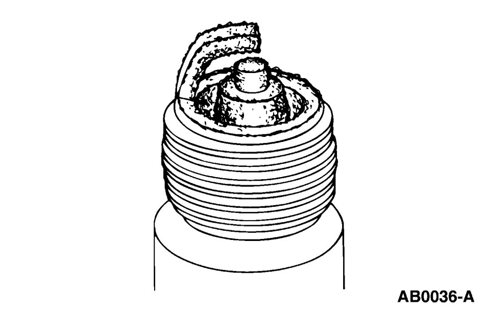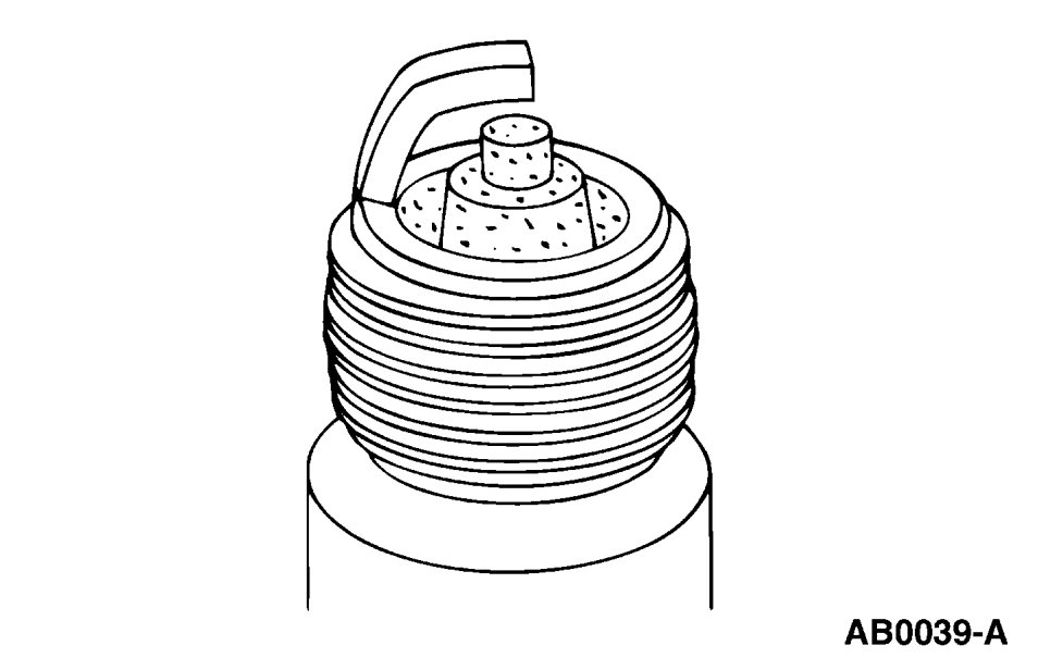 - Check for wet, black deposits on the insulator shell bore electrodes, caused by excessive oil entering the combustion chamber through worn rings and pistons, excessive valve-to-guide clearance or worn or loose bearings.