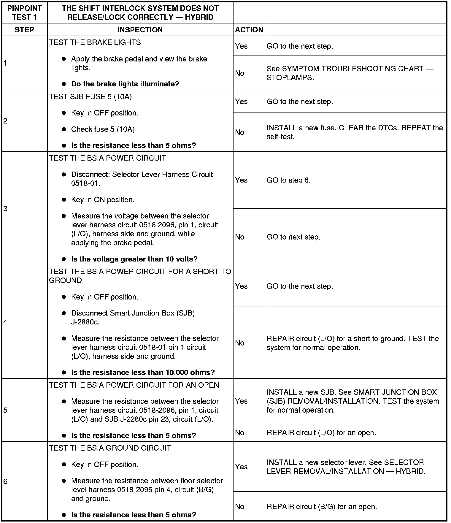 PINPOINT TEST 1: THE SHIFT INTERLOCK SYSTEM DOES NOT RELEASE/LOCK CORRECTLY - HYBRID