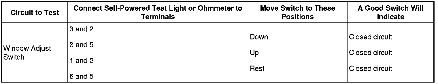 2. Inspect for continuity between the window control switch terminals using a self-powered test light or an ohmmeter.