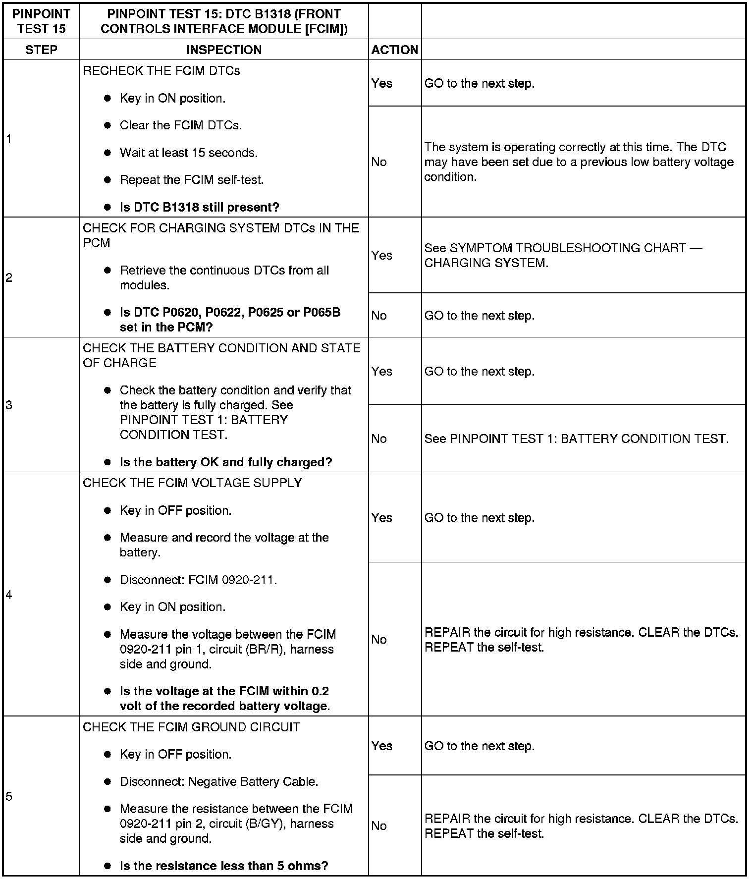 PINPOINT TEST 15: DTC B1318 (FRONT CONTROLS INTERFACE MODULE [FCIM])