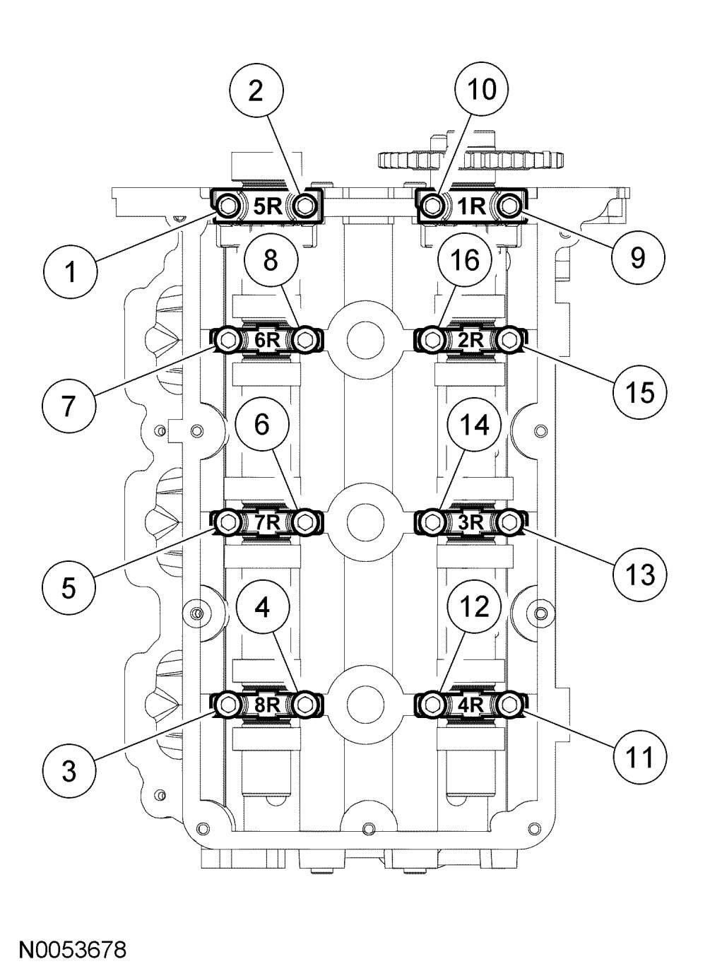 a. Remove the camshaft bearing thrust caps (5R and 1R).