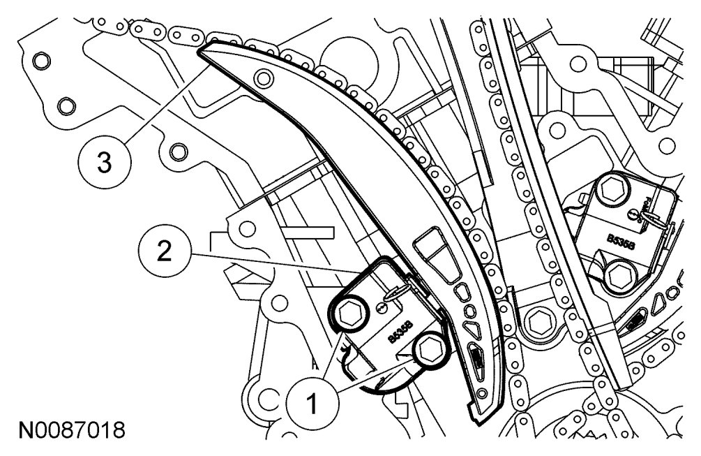 7. Position the LH timing chain and guide and install the bolts.