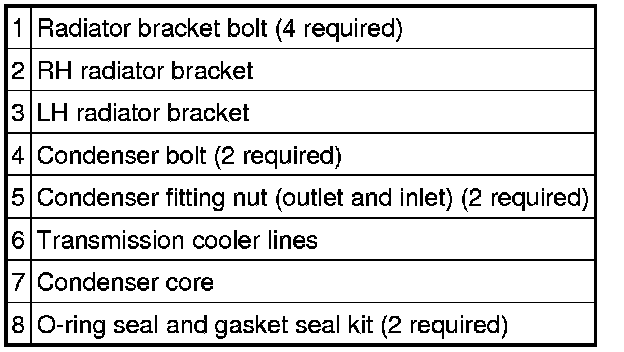 NOTE:If a condenser core leak is suspected, the condenser core must be leak tested before it is removed from the vehicle. See A/C Evaporator/Condenser On-Vehicle Leak Test.
