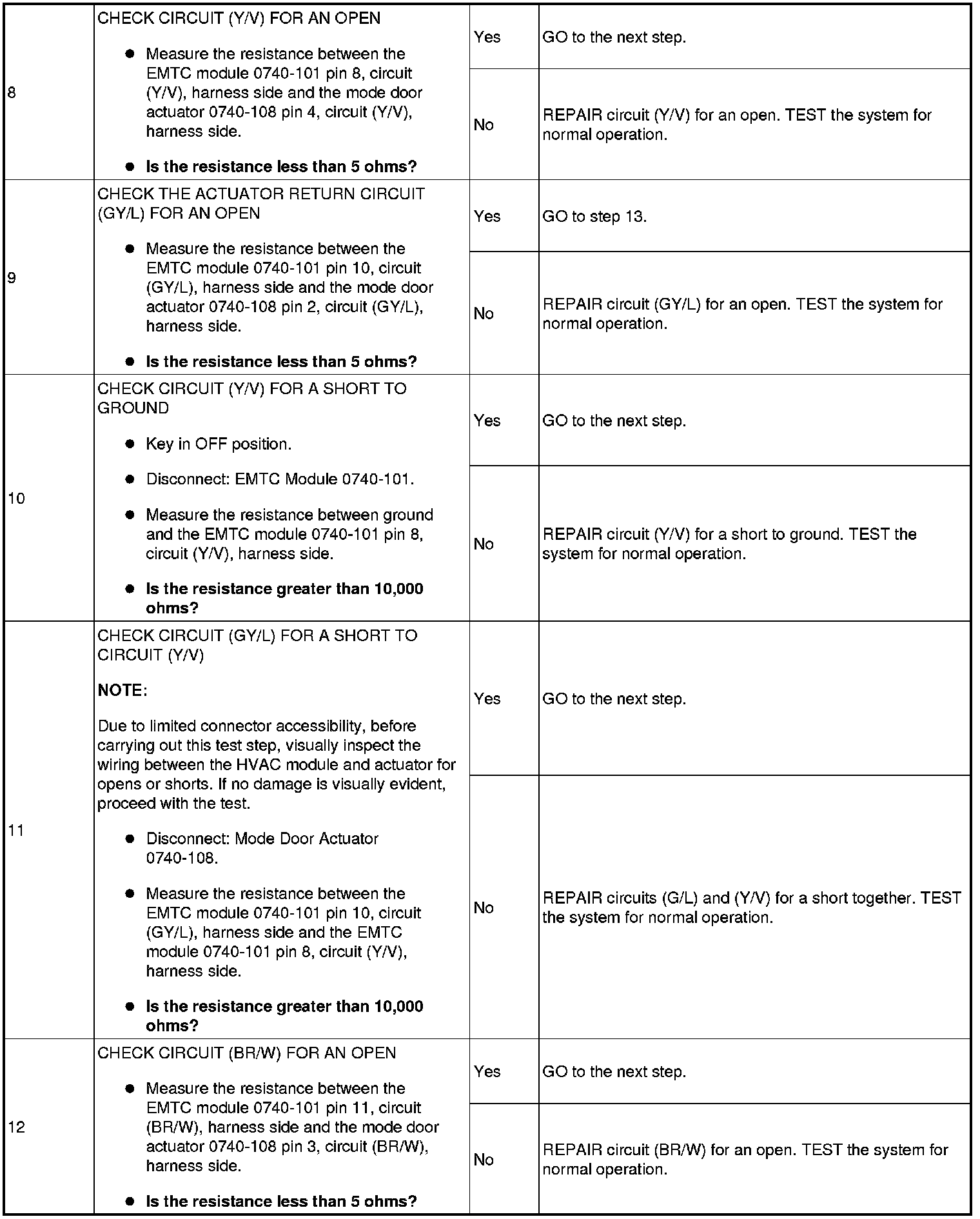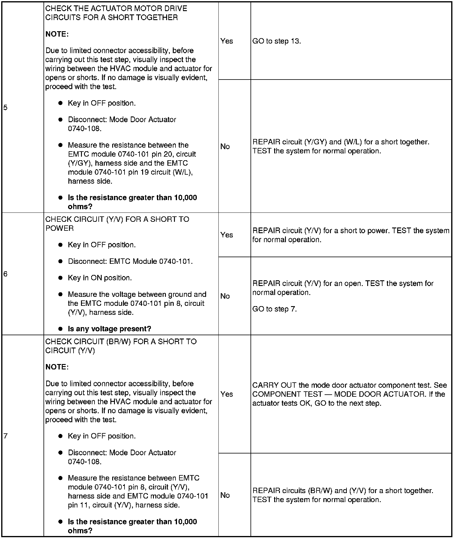 To rotate the mode door actuator clockwise, the electronic manual temperature control (EMTC) module supplies voltage to the FLOOR/DEFROST/PANEL mode door actuator motor through circuit (Y/GY), and supplies ground through circuit (W/L). To rotate the mode door actuator counterclockwise, the EMTC module reverses the voltage and ground circuits.The mode door actuator feedback resistor is supplied a ground from the EMTC module through circuit (GY/L) and a 5-volt reference voltage on circuit (BR/W). The EMTC module reads the voltage on the mode door actuator feedback circuit (Y/V) to determine the mode door actuator position by the position of the actuator feedback resistor wiper arm.