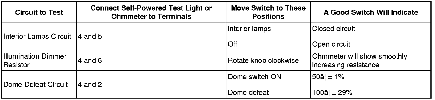 2. Inspect for continuity between the instrument panel dimmer switch terminals using a self-powered test light or an ohmmeter.