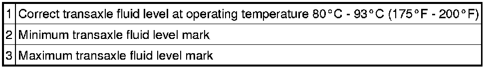 CAUTION:The vehicle should not be driven if the transaxle fluid level indicator shows the transaxle fluid below the minimum transaxle fluid level mark or internal failure could result.