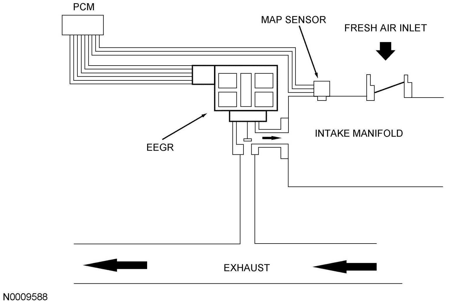 The EEGR system monitor is an on-board strategy designed to test the integrity and flow characteristics of the EGR system. The monitor is activated during EGR system operation and after certain base engine conditions are satisfied. Inputs from the cylinder head temperature (CHT), intake air temperature (IAT), throttle position (TP), crankshaft position (CKP), mass air flow (MAF), and manifold absolute pressure (MAP) sensors are required to activate the EGR system monitor. Once activated, the EGR system monitor carries out each of the tests described below during the engine modes and conditions indicated. Some of the EGR system monitor tests are also carried out during a key on engine off (KOEO) or key on engine running (KOER) self-test.