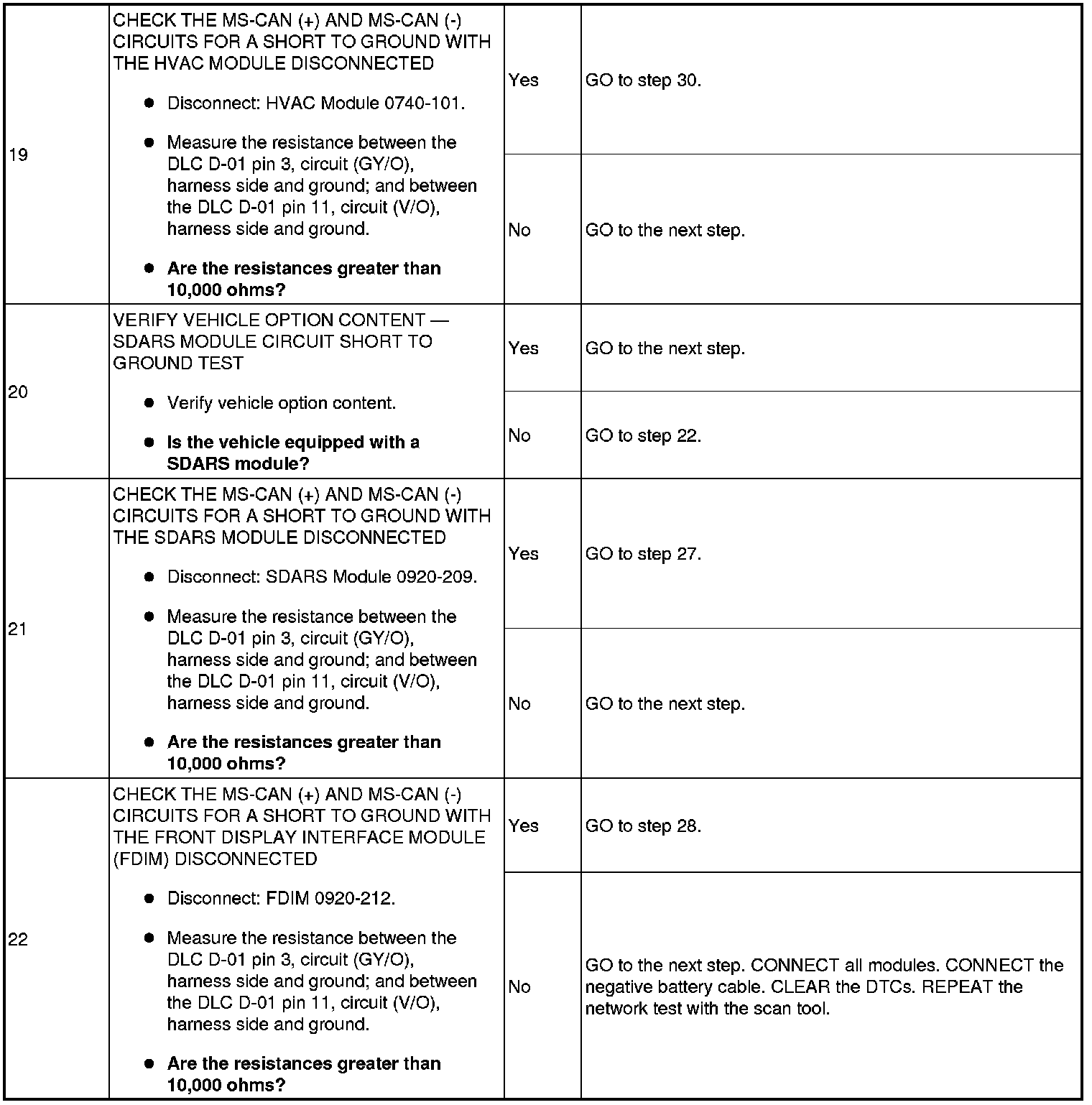 The medium speed controller area network (MS-CAN) uses an unshielded twisted pair cable, circuits (GY/O) and (V/O). The smart junction box (SJB), audio control module (ACM), satellite digital audio receiver system (SDARS) module, front display interface module (FDIM), front controls interface module (FCIM), and the HVAC module communicate with the scan tool using the MS-CAN. The instrument cluster (IC), while on the MS-CAN, communicates with the scan tool only on the HS-CAN.