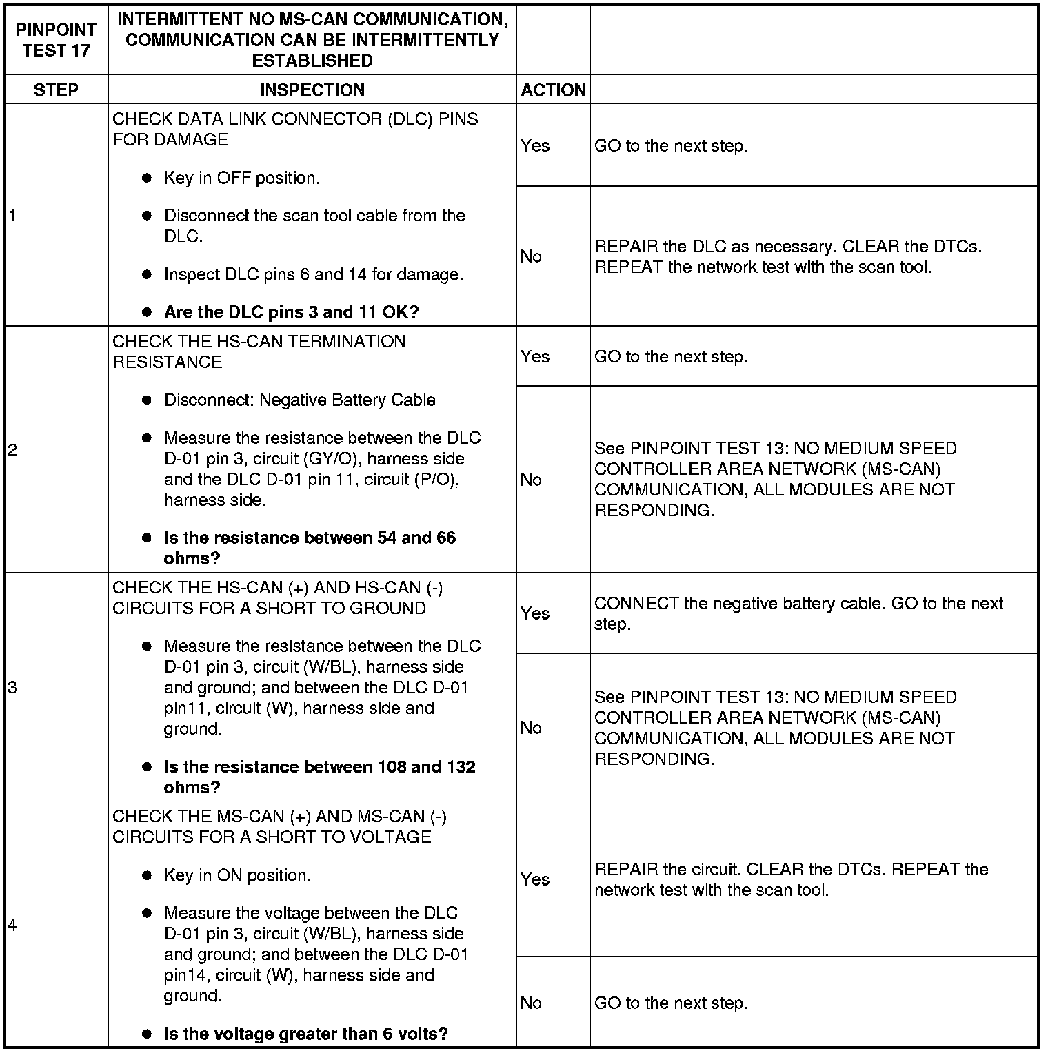 PINPOINT TEST 17: INTERMITTENT NO MEDIUM SPEED CONTROLLER AREA NETWORK (MS-CAN) COMMUNICATION, COMMUNICATION CAN BE INTERMITTENTLY ESTABLISHED