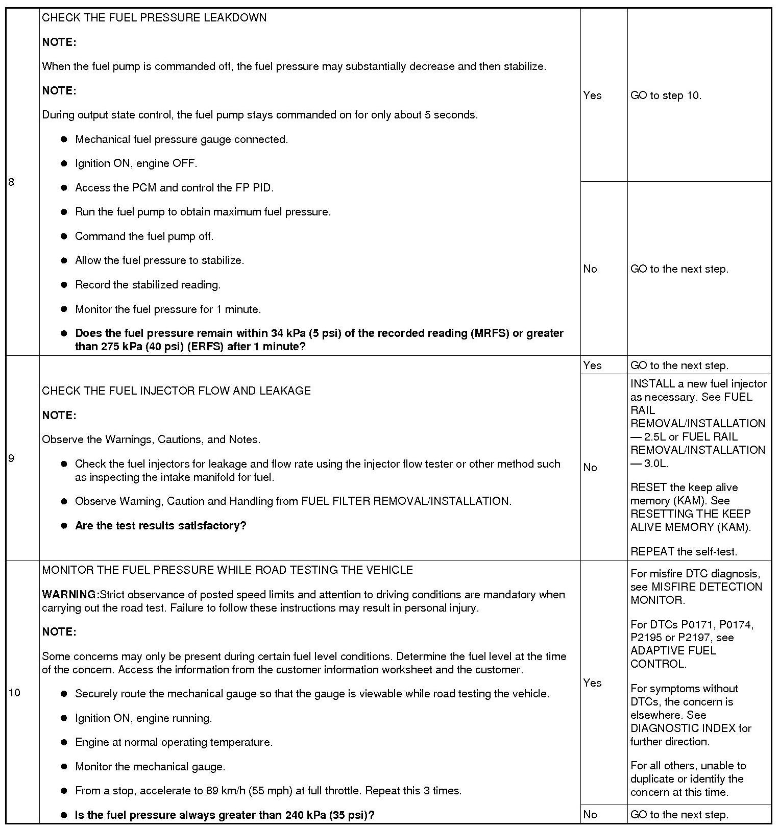 WARNING:The fuel system remains under pressure after the engine is off. Relieve pressure before repairing. Highly flammable mixtures are present. To release pressure from the fuel system, carry out the following:Connect Fuel Pressure Test Kit 310-D009 (D95L-7211A) or equivalent.Gradually open the testing kit valve to relieve the fuel pressure in the vehicle fuel system and drain the fuel into a suitable container or return it to the fuel tank.To avoid unnecessary fuel spillage and fire hazard, any time fuel lines are disconnected, the ignition switch must be in the OFF position unless fuel pump operation is required for test purposes.Failure to follow these instructions may result in personal injury.