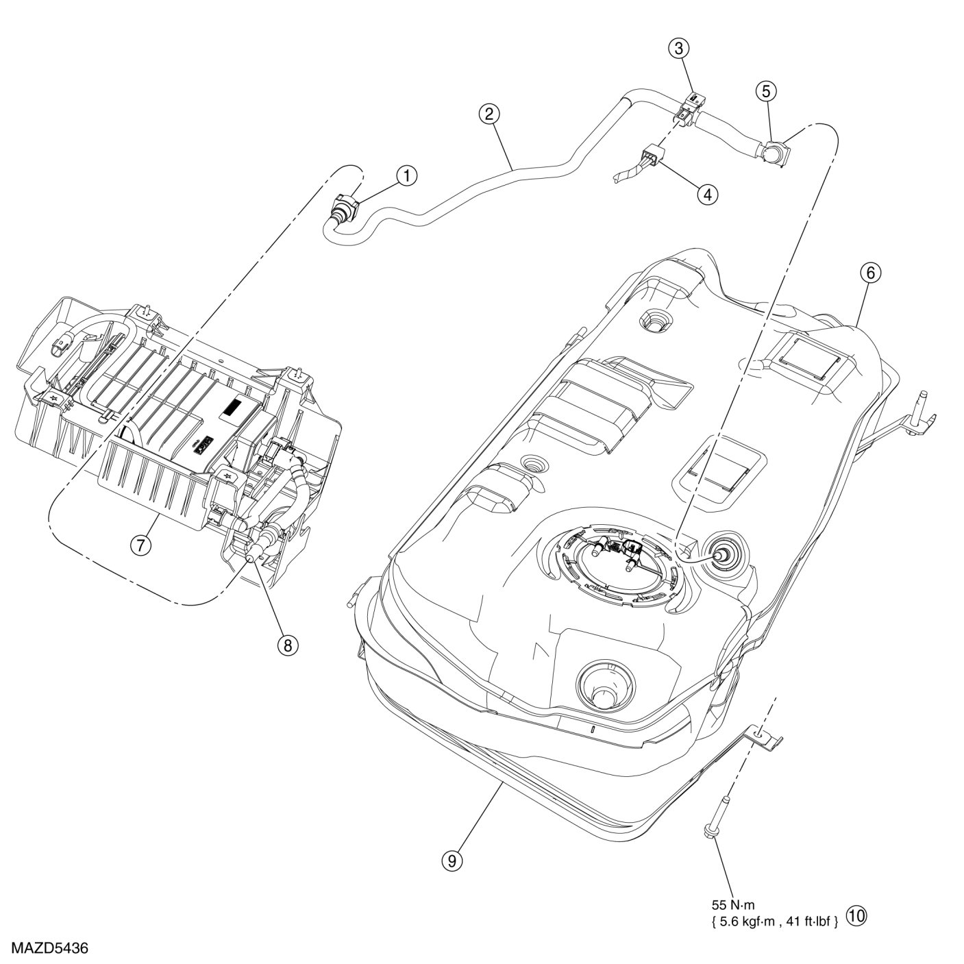 5. Partially lower the LH side of the fuel tank enough to access the fuel vapor tube assembly.